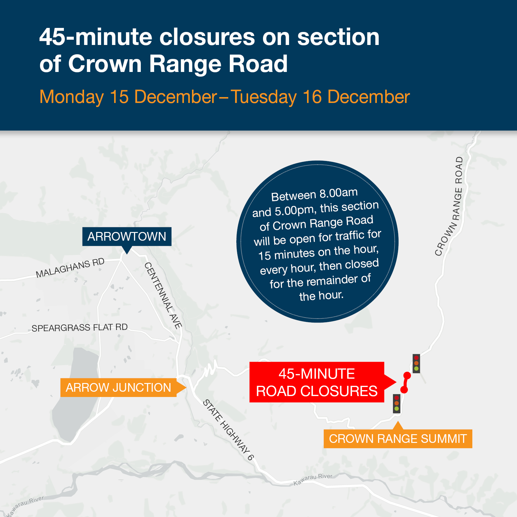 The road will be open for 15 minutes on the hour, every hour on Monday 15 and Tuesday 16 December