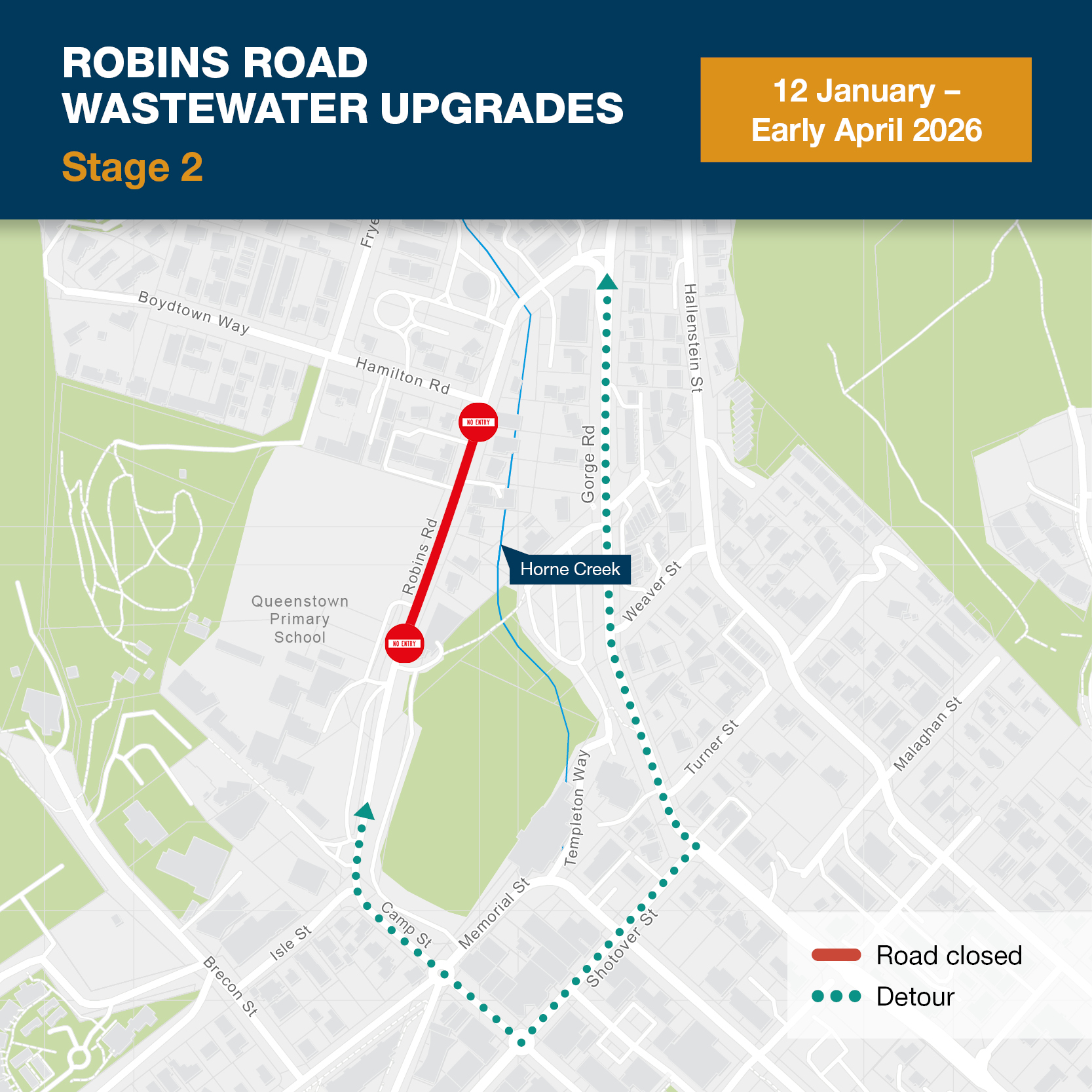 Map of early January worksite and Robins Road closure: https://www.qldc.govt.nz/media/jxdjaboj/qldc_robins-road-wastewater-upgrades_social-800x800px_nov25_stage-2.jpg