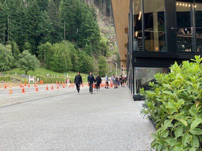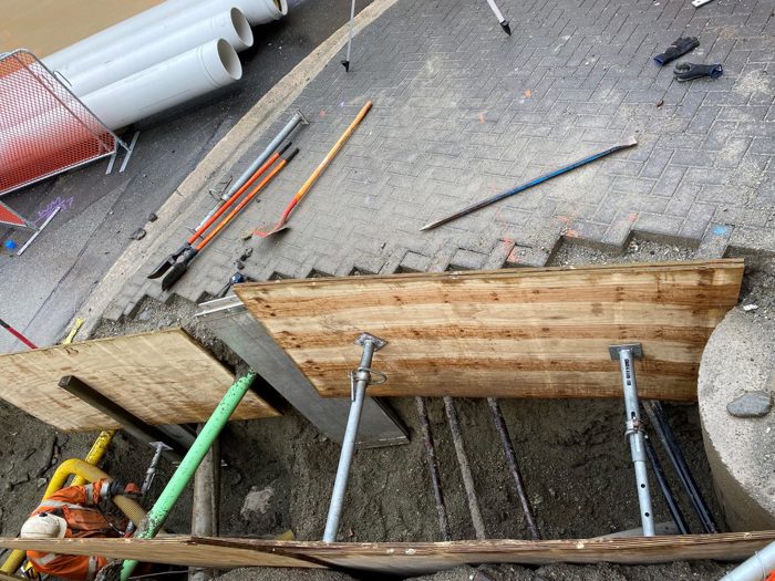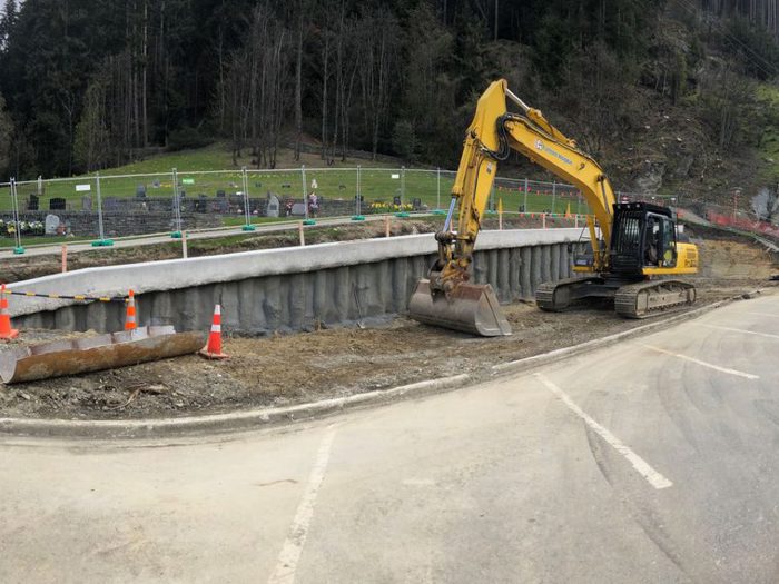 New retaining wall on upper Brecon Street. The purpose of the retaining wall is to build two generous paths that safely separate mountain bikers from pedestrians at the top of Brecon Street. (Oct-21)