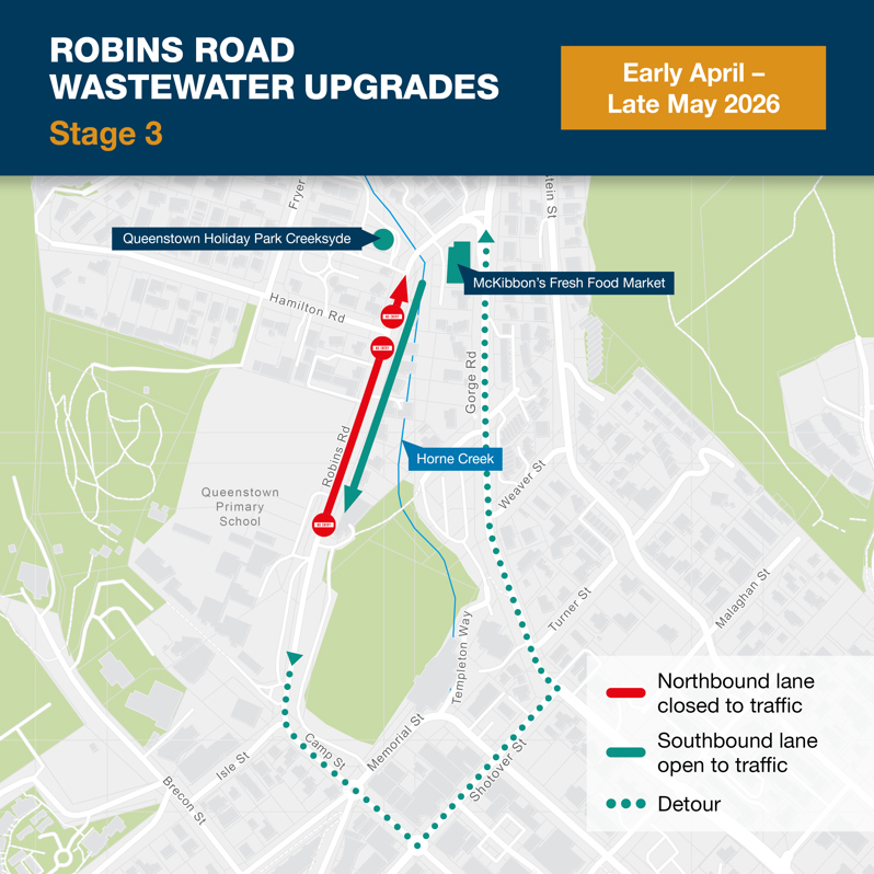 The northbound lane on Robins Road will be closed from Queenstown Park Boutique Hotel through to Queenstown Holiday Park Creeksyde during this stage of work. The southbound lane will remain open.